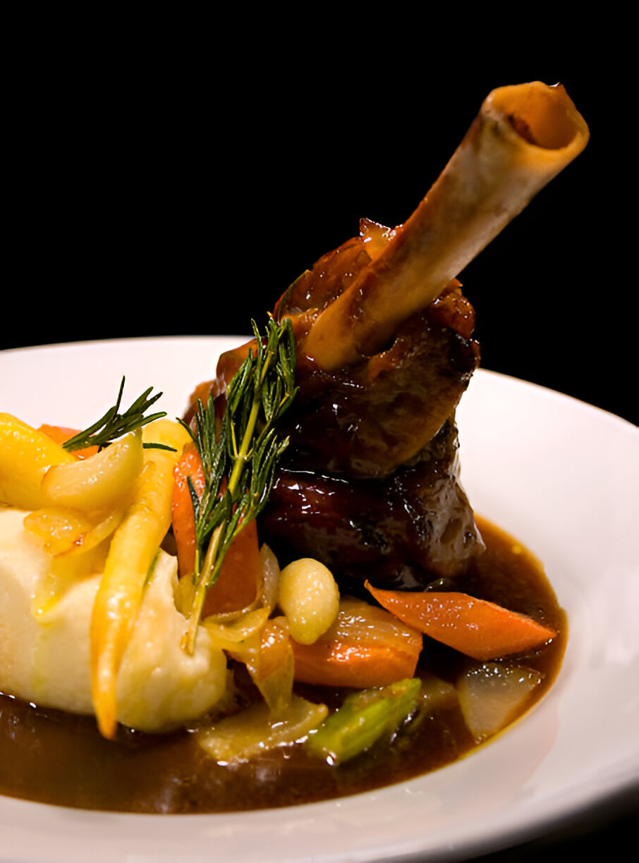 Slow Cooked Lamb Shank Cooked In Red Wine And Rosemary Sauce Served With Mash And Veg.